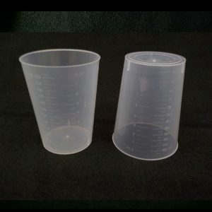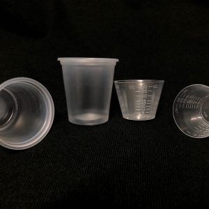 Código: 02102A la caja tiene 1150 piezas divididas en bolsas de 25 cada una; su capacidad es de 60cc(ml) o 2 oz.; está graduado en incrementos de 5cc(ml) hasta 30ml, 45ml y 60ml. y onzas; mide 5cm de alto y 5cm de diámetro en la parte superior y 4cm de diámetro en la base.