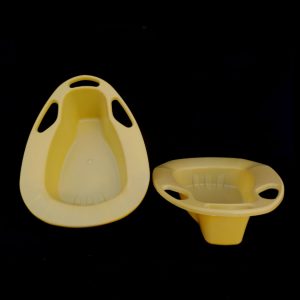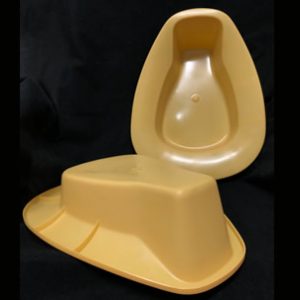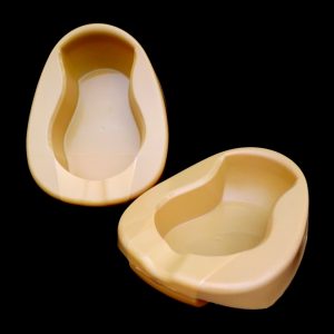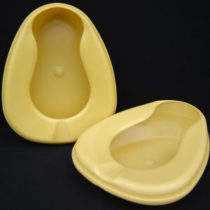 Marca Medegen, la caja tiene 50 piezas, llamado también cómodo para fracturados, su capacidad es de 1 litro, mide 30cm de largo, ancho 23cm; altura delantera 9cm, y altura trasera de 3cm; es de polipropileno. Diseñados para los pacientes fracturados o inmovilizados, útiles como orinal femenino y pediátrico, tiene forma de cuña y agarradera integrada, para facilitar su colocación.