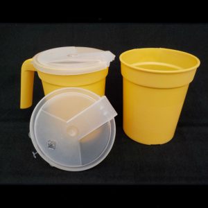 Marca Medegen, la caja tiene 100 piezas con capacidad de 1 litro, mide 15.5 cm de alto, diámetro superior 12cm, diámetro en la base 8.8cm. Están hechas en polipropileno. Diseñada con asa para facilitar su uso con una sola mano y tapa que incluye una rejilla para mantener el hielo en la jarra. Ayuda a mantener fríos los líquidos.