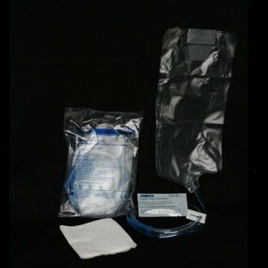 Marca AMSINO, la caja cuenta con 50 piezas; El kit está integrado por la bolsa con una sonda de 1.5m de punta prelubricada, una pinza para regular la cantidad y el flujo, su capacidad es de 1.5litros; incluye un sobre de jabón de Castilla concentrado y campo impermeable para protección de la cama. Cuenta con asa para colgarse fácilmente al soporte de cama y toalleros.