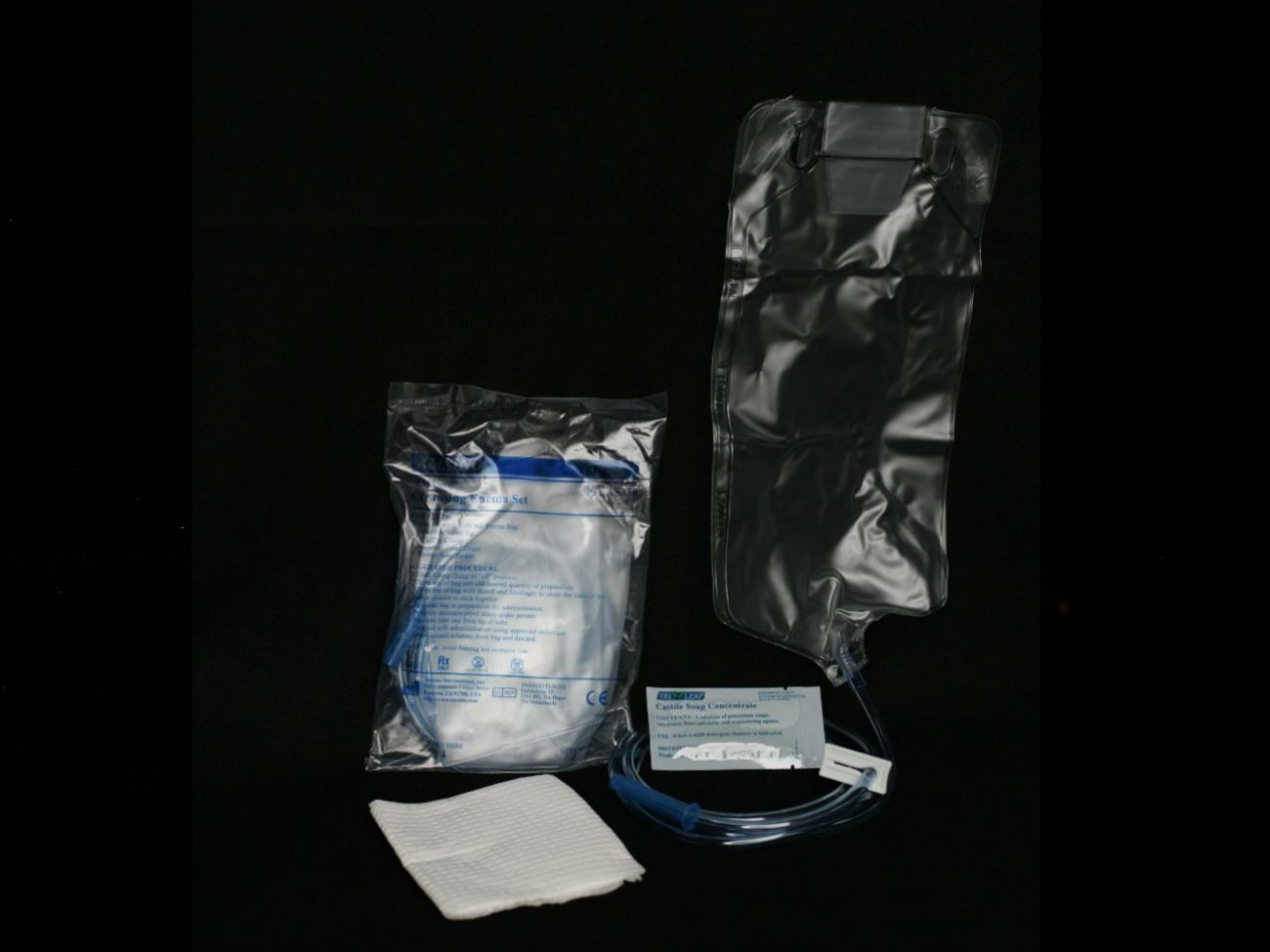 Marca AMSINO, la caja cuenta con 50 piezas; El kit está integrado por la bolsa con una sonda de 1.5m de punta prelubricada, una pinza para regular la cantidad y el flujo, su capacidad es de 1.5litros; incluye un sobre de jabón de Castilla concentrado y campo impermeable para protección de la cama. Cuenta con asa para colgarse fácilmente al soporte de cama y toalleros.