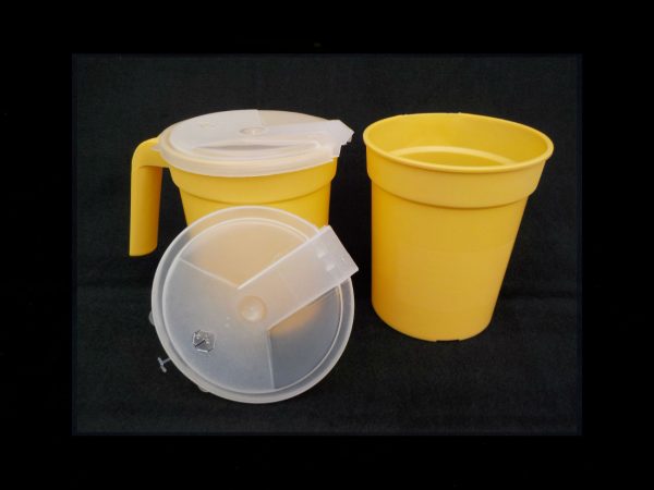 Marca Medegen, la caja tiene 100 piezas con capacidad de 1 litro, mide 15.5 cm de alto, diámetro superior 12cm, diámetro en la base 8.8cm. Están hechas en polipropileno. Diseñada con asa para facilitar su uso con una sola mano y tapa que incluye una rejilla para mantener el hielo en la jarra. Ayuda a mantener fríos los líquidos.