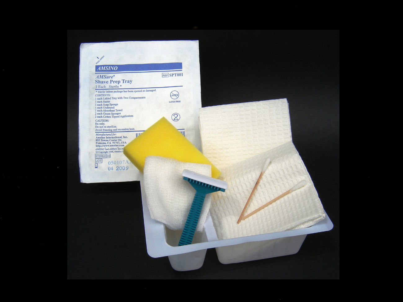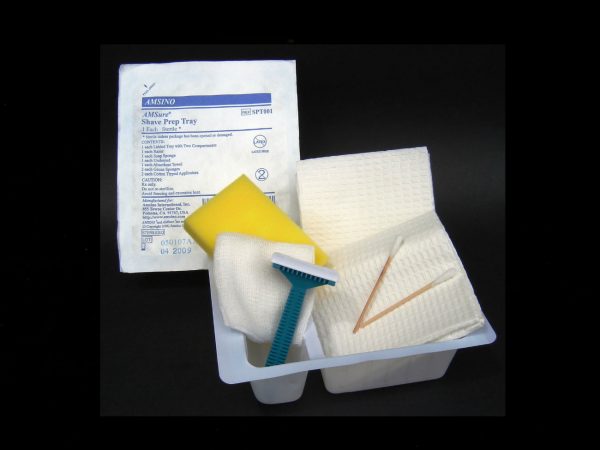 Marca AMSINO, la caja contiene 20 kits, este juego cuenta con todo lo necesario para realizar un afeitado prequirúrgico: 1 rastrillo, 1 esponja impregnada con jabón, 1 campo impermeable, 1 toalla de papel absorbente, 2 esponjas de gasa simple, 2 aplicadores con punta de algodón y bandeja de dos compartimientos, uno para preparar la solución jabonosa y otro para enjuagar el rastrillo.