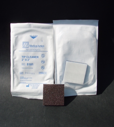 Marca Medical Action, la caja cuenta con 100 piezas, divididas en cajas de 25 cada una, son estériles y empacado individualmente, mide 5x5cm (2×2″) y tiene 5mm de espesor. Están fabricados con una capa de fibra sintética abrasiva y otra esponjosa con adhesivo.