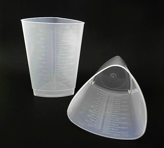 Marca Medegen, la caja tiene 200 piezas, es un recipiente triangular; su capacidad es de 1 litro o 32oz, graduado en incrementos de 25ml; mide 15.5cm de alto, 8.5cm por lado en la base y 12cm por lado en la parte superior; está hecha de polipropileno, translucido, irrompible, es ideal para medir tomas o salidas; también incluye una sección para anotar la información del paciente.